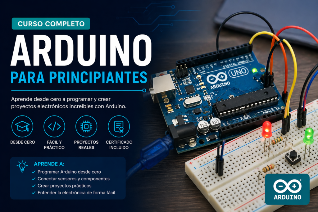 📝 Descripción del curso Aprende desde cero a trabajar con Arduino y desarrolla proyectos electrónicos de manera práctica. Este curso está diseñado para introducirte en el mundo de la programación y la electrónica, permitiéndote crear tus propios sistemas automatizados paso a paso.